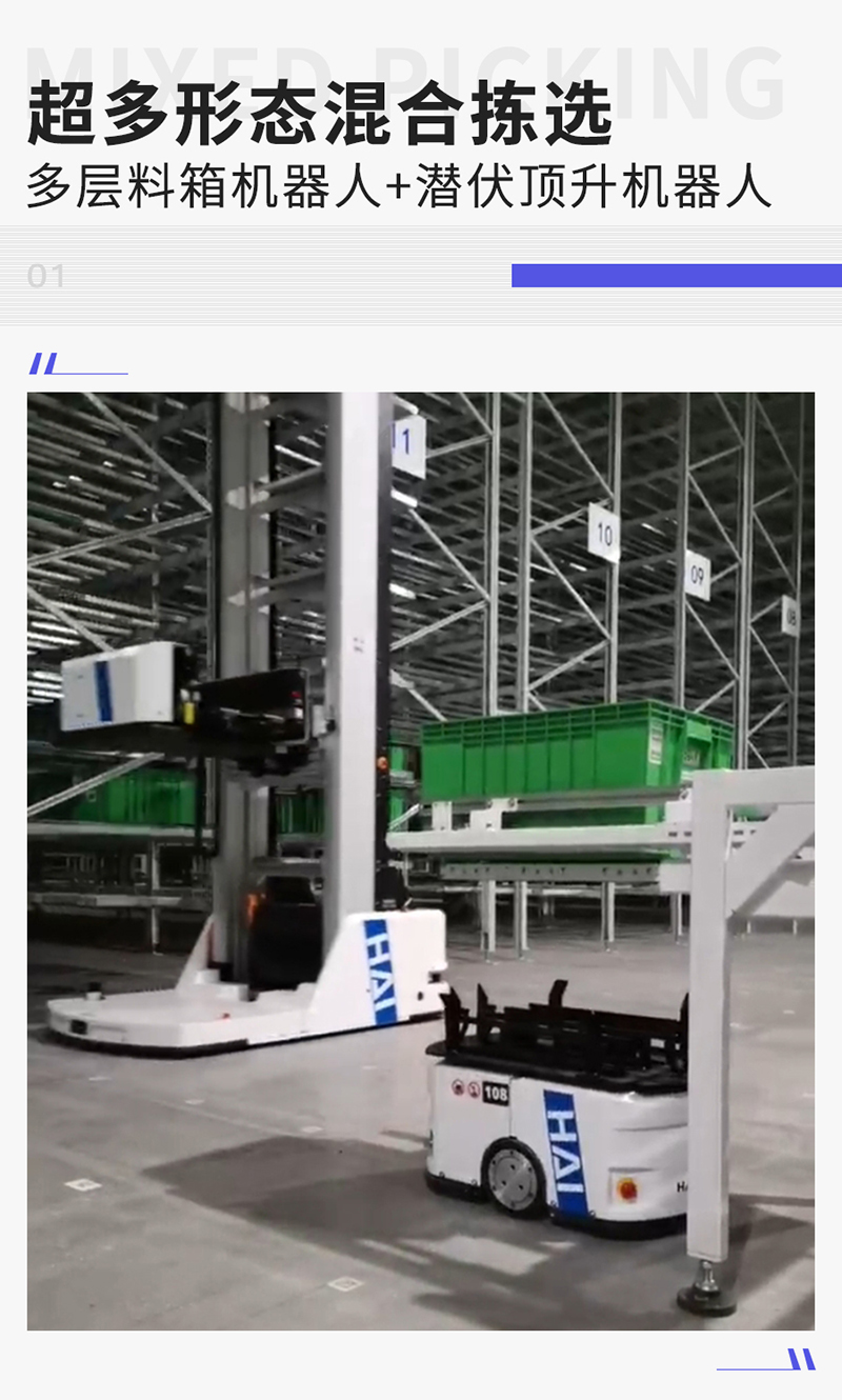 “大小車”同場協(xié)作多形態(tài)混存揀選是一種創(chuàng)新的倉儲物流解決方案,它結(jié)合了不同類型的自動化設(shè)備(通常指多層料箱機(jī)器人與極速潛伏頂升式機(jī)器人等),在同一倉儲空間內(nèi)協(xié)同作業(yè),處理多種存儲形態(tài)的貨物。料箱機(jī)器人負(fù)責(zé)貨架上層貨物的整理存取,潛伏頂升式機(jī)器人AMR負(fù)責(zé)將貨物運(yùn)送至人工揀選工作站,不同的機(jī)器人相互配合,優(yōu)勢互補(bǔ),提升了存儲密度和取放貨效率。從而為客戶實現(xiàn)了更加高效的“貨到人”一站式智能揀選新模式。